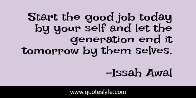 This page presents the quote "Start the good job today by your self and let the generation end it tomorrow by them selves.". Author of this quote is Issah Awal. .