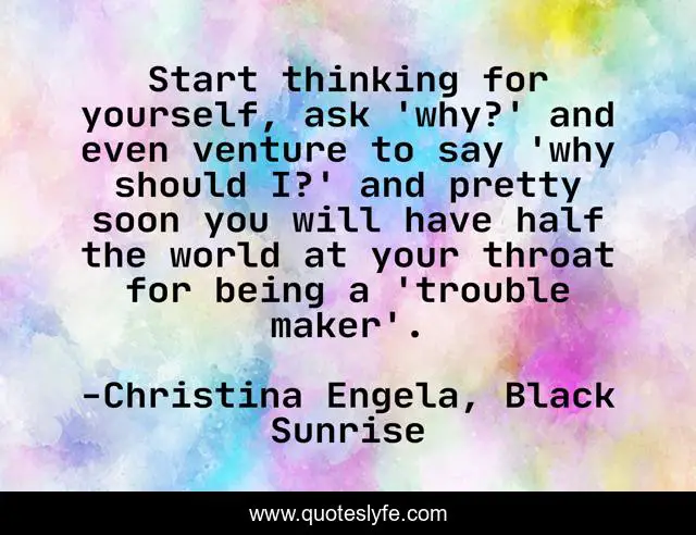 This page presents the quote "Start thinking for yourself, ask 'why?' and even venture to say 'why should I?' and pretty soon you will have half the world at your throat for being a 'trouble maker'.". Author of this quote is Christina Engela, Black Sunrise. This quote is about thinking, trouble-maker, venture, half, throat, world, why,.