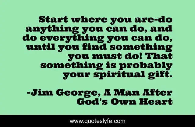 This page presents the quote "Start where you are-do anything you can do, and do everything you can do, until you find something you must do! That something is probably your spiritual gift.". Author of this quote is Jim George, A Man After God's Own Heart. This quote is about love, spiritual, christian, gift, wife, god, father, calling, start,.