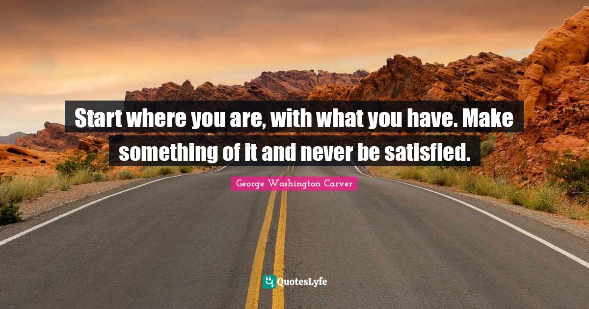This page presents the quote "Start where you are, with what you have. Make something of it and never be satisfied.". Author of this quote is George Washington Carver. This quote is about satisfied, where you are, hard times,.