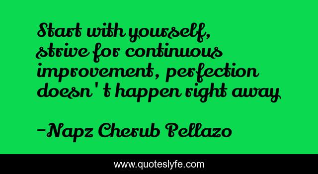 This page presents the quote "Start with yourself, strive for continuous improvement, perfection doesn't happen right away". Author of this quote is Napz Cherub Pellazo. This quote is about life, inpirational,.