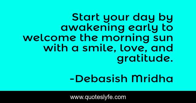 This page presents the quote "Start your day by awakening early to welcome the morning sun with a smile, love, and gratitude.". Author of this quote is Debasish Mridha. This quote is about gratitude, miraboli, oscar-wilde, debasish-mridha, philosophy, new-day, tagore, quotes, buddha,.