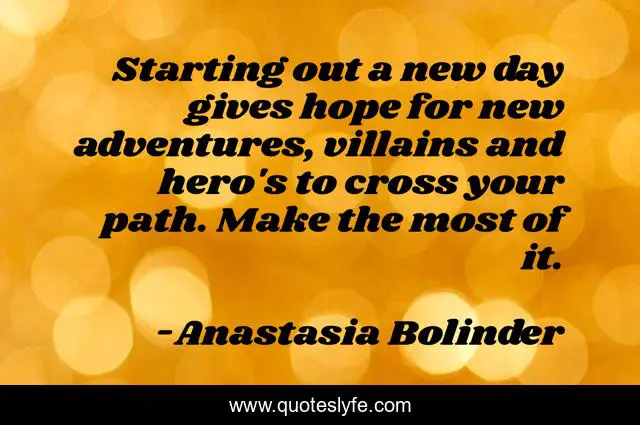 This page presents the quote "Starting out a new day gives hope for new adventures, villains and hero's to cross your path. Make the most of it.". Author of this quote is Anastasia Bolinder. This quote is about hero, new-day, adventures, adventure, heros, hope,.