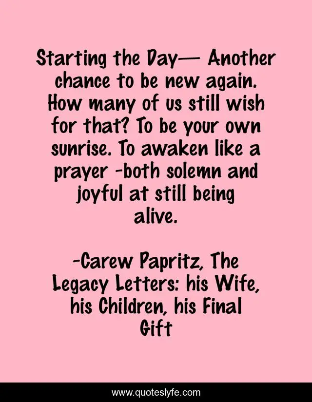 This page presents the quote "Starting the Day— Another chance to be new again. How many of us still wish for that? To be your own sunrise. To awaken like a prayer -both solemn and joyful at still being alive.". Author of this quote is Carew Papritz, The Legacy Letters: his Wife, his Children, his Final Gift. This quote is about author, quote, quotes, starting-the-day, new, inspirational-books, day, sunrise,.