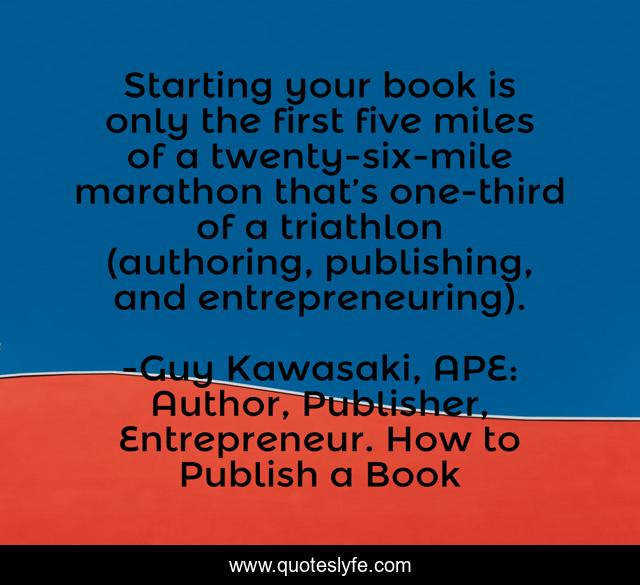 This page presents the quote "Starting your book is only the first five miles of a twenty-six-mile marathon that’s one-third of a triathlon (authoring, publishing, and entrepreneuring).". Author of this quote is Guy Kawasaki, APE: Author, Publisher, Entrepreneur. How to Publish a Book. This quote is about self-publishing, writing-process, writing,.
