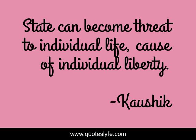 This page presents the quote "State can become threat to individual life, cause of individual liberty.". Author of this quote is Kaushik. This quote is about life, state, liberty,.