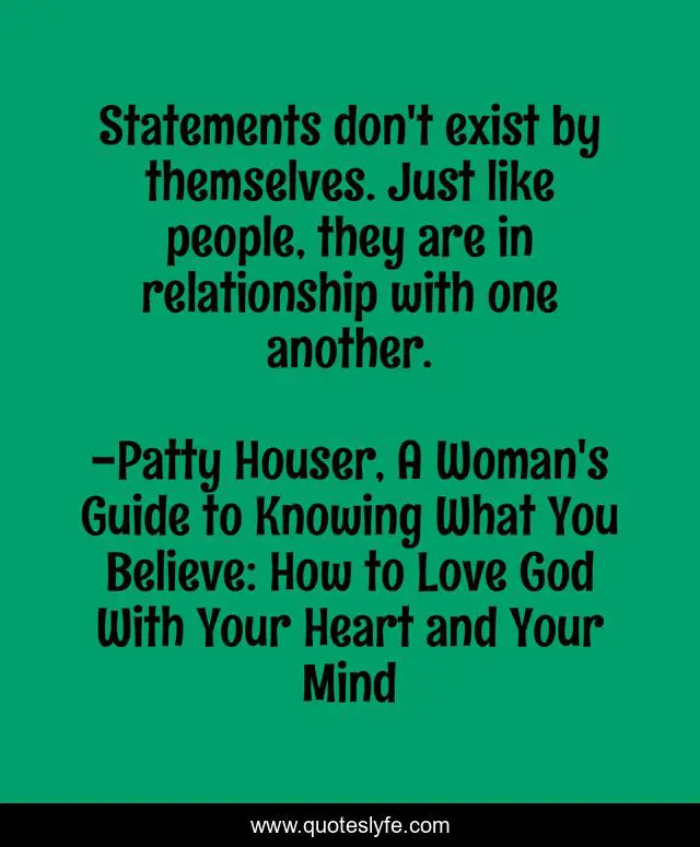 "Patty Houser, A Woman's Guide to Knowing What You Believe: How to Love God With Your Heart and Your Mind Quotes." Quoteslyfe.com, 2025. Fri. 05 Dec. 2025. <https://www.quoteslyfe.com/quote/Statements-don-t-exist-by-themselves-Just-228901>.