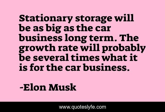 This page presents the quote "Stationary storage will be as big as the car business long term. The growth rate will probably be several times what it is for the car business.". Author of this quote is Elon Musk. This quote is about growth, business, long,.