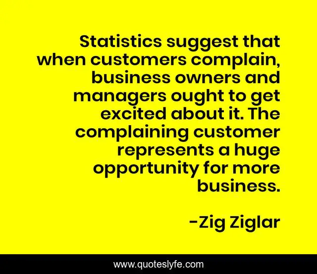 This page presents the quote "Statistics suggest that when customers complain, business owners and managers ought to get excited about it. The complaining customer represents a huge opportunity for more business.". Author of this quote is Zig Ziglar. This quote is about statistics, opportunity,.