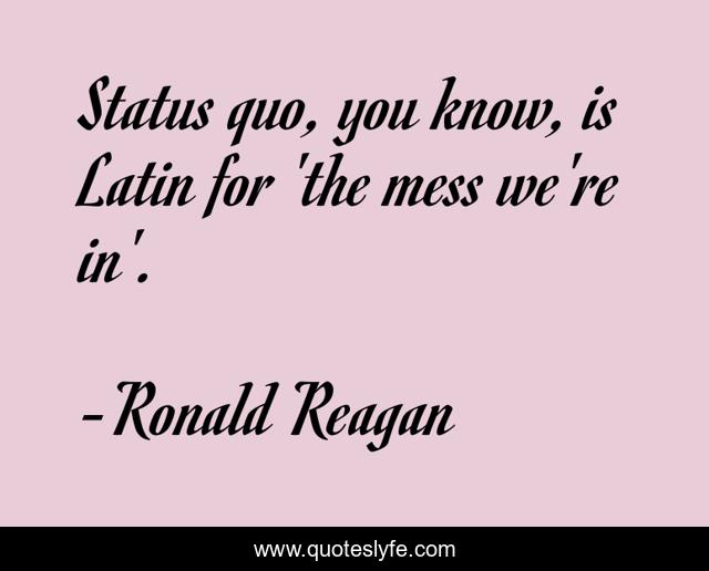 This page presents the quote "Status quo, you know, is Latin for 'the mess we're in'.". Author of this quote is Ronald Reagan. This quote is about politics, latin, inspirational, enthusiasm,.