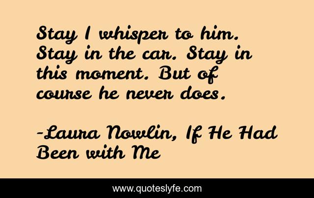 This page presents the quote "Stay I whisper to him. Stay in the car. Stay in this moment. But of course he never does.". Author of this quote is Laura Nowlin, If He Had Been with Me. This quote is about autumn, finny, sad,.