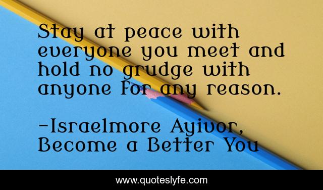 This page presents the quote "Stay at peace with everyone you meet and hold no grudge with anyone for any reason.". Author of this quote is Israelmore Ayivor, Become a Better You. This quote is about food-for-thought, at-peace-with-all, success, better-you, meekness, season, angry, peace, israelmore-ayivor,.