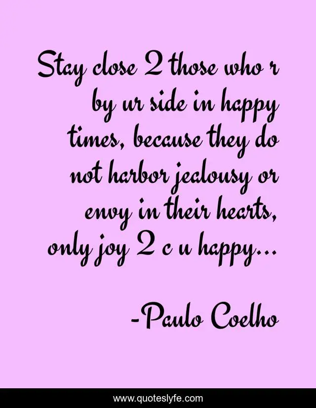 This page presents the quote "Stay close 2 those who r by ur side in happy times, because they do not harbor jealousy or envy in their hearts, only joy 2 c u happy...". Author of this quote is Paulo Coelho. .