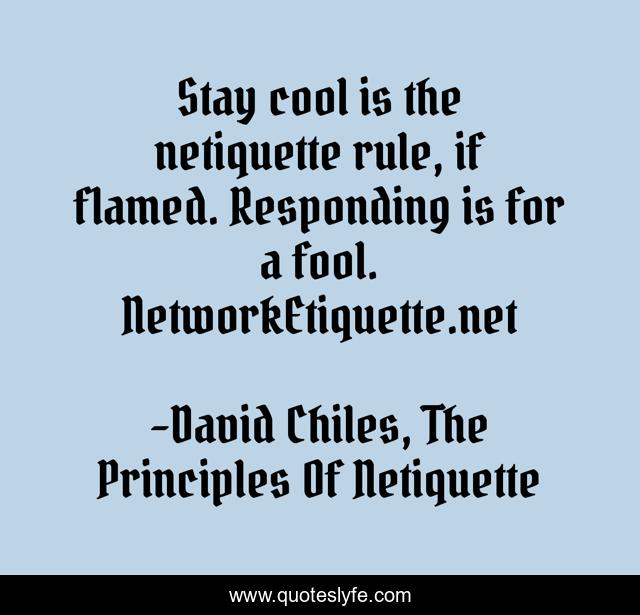 This page presents the quote "Stay cool is the netiquette rule, if flamed. Responding is for a fool. NetworkEtiquette.net". Author of this quote is David Chiles, The Principles Of Netiquette. This quote is about troll, social-media, rules-for-netiquette, digital-etiquette, internet-etiquette, netiquette-rules, good-netiquette, netiquette, flame,.