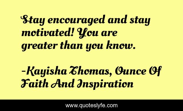 This page presents the quote "Stay encouraged and stay motivated! You are greater than you know.". Author of this quote is Kayisha Thomas, Ounce Of Faith And Inspiration. This quote is about motivation, encouragement, inspiration,.