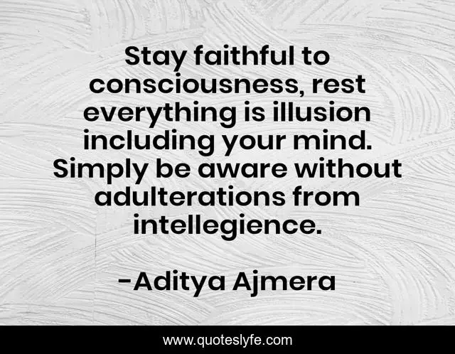 This page presents the quote "Stay faithful to consciousness, rest everything is illusion including your mind. Simply be aware without adulterations from intellegience.". Author of this quote is Aditya Ajmera. This quote is about conciousness, mind, illusion, awareness,.