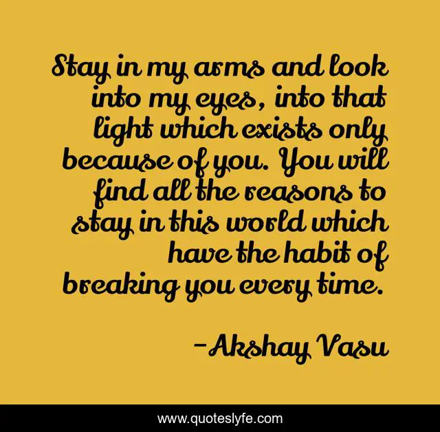 This page presents the quote "Stay in my arms and look into my eyes, into that light which exists only because of you. You will find all the reasons to stay in this world which have the habit of breaking you every time.". Author of this quote is Akshay Vasu. This quote is about break, love, reasons, light, arms, stay, romance, special, world,.