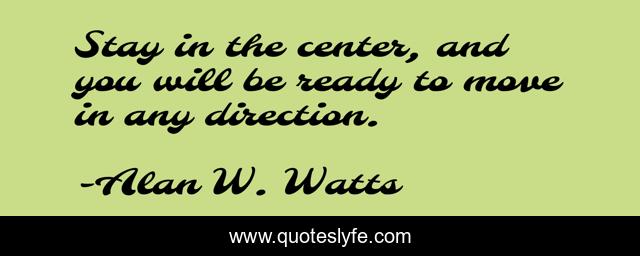This page presents the quote "Stay in the center, and you will be ready to move in any direction.". Author of this quote is Alan W. Watts. This quote is about philosophy, zen, centeredness, expectations,.