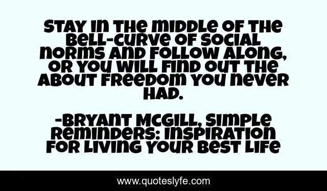 This page presents the quote "Stay in the middle of the bell-curve of social norms and follow along, or you will find out the about freedom you never had.". Author of this quote is Bryant McGill, Simple Reminders: Inspiration for Living Your Best Life. This quote is about freedom, normalcy, social,.