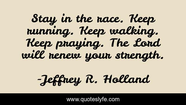 This page presents the quote "Stay in the race. Keep running. Keep walking. Keep praying. The Lord will renew your strength.". Author of this quote is Jeffrey R. Holland. This quote is about peace, strength, prayer,.