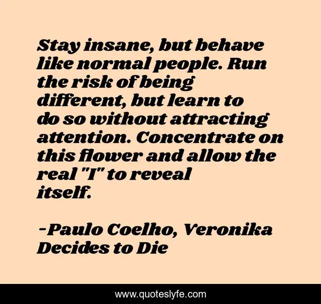This page presents the quote "Stay insane, but behave like normal people. Run the risk of being different, but learn to do so without attracting attention. Concentrate on this flower and allow the real "I" to reveal itself.". Author of this quote is Paulo Coelho, Veronika Decides to Die. This quote is about normality, insanity,.