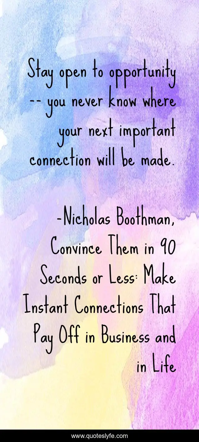 "Nicholas Boothman, Convince Them in 90 Seconds or Less: Make Instant Connections That Pay Off in Business and in Life Quotes." Quoteslyfe.com, 2025. Fri. 05 Dec. 2025. <https://www.quoteslyfe.com/quote/Stay-open-to-opportunity-you-never-know-179690>.