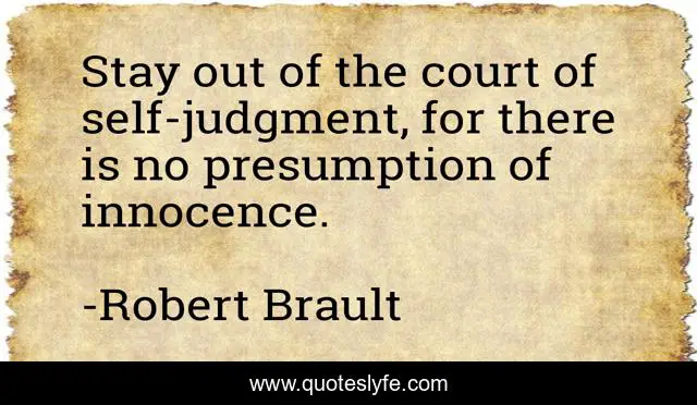 This page presents the quote "Stay out of the court of self-judgment, for there is no presumption of innocence.". Author of this quote is Robert Brault. This quote is about ego, esteem, self-judgement, guilt, judgment, self-esteem,.