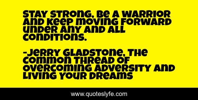 This page presents the quote "Stay strong, be a warrior and keep moving forward under any and all conditions.". Author of this quote is Jerry Gladstone, The Common Thread of Overcoming Adversity and Living Your Dreams. This quote is about empowering, confidence, positive, motivational, optimistic, inspirational, quotes-to-live-by, enthusiasm,.