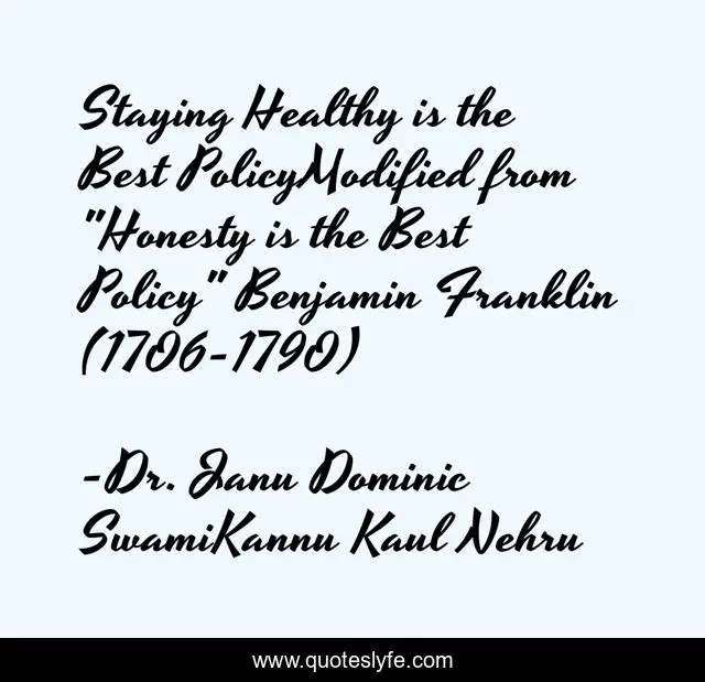 This page presents the quote "Staying Healthy is the Best PolicyModified from "Honesty is the Best Policy" Benjamin Franklin (1706-1790)". Author of this quote is Dr. Janu Dominic SwamiKannu Kaul Nehru. This quote is about health, insurance-policy,.