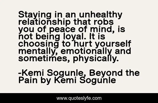 This page presents the quote "Staying in an unhealthy relationship that robs you of peace of mind, is not being loyal. It is choosing to hurt yourself mentally, emotionally and sometimes, physically.". Author of this quote is Kemi Sogunle, Beyond the Pain by Kemi Sogunle. This quote is about physical-abuse, love, relationship, beyond-the-pain, relationship-advice-for-men, self-awareness, self-help, unhealthy-relationships, emotional-abuse,.