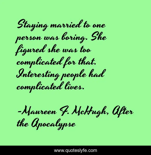 This page presents the quote "Staying married to one person was boring. She figured she was too complicated for that. Interesting people had complicated lives.". Author of this quote is Maureen F. McHugh, After the Apocalypse. This quote is about interestingness, divorce, marriage, complications,.