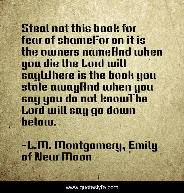 "L.M. Montgomery, Emily of New Moon Quotes." Quoteslyfe.com, 2025. Sun. 07 Dec. 2025. <https://www.quoteslyfe.com/quote/Steal-not-this-book-for-fear-of-158127>.