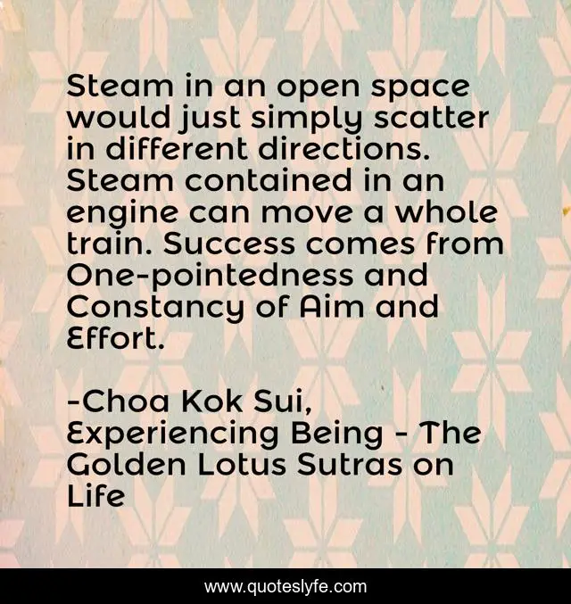 This page presents the quote "Steam in an open space would just simply scatter in different directions. Steam contained in an engine can move a whole train. Success comes from One-pointedness and Constancy of Aim and Effort.". Author of this quote is Choa Kok Sui, Experiencing Being - The Golden Lotus Sutras on Life. This quote is about achievement, effort, goal, success, purpose,.