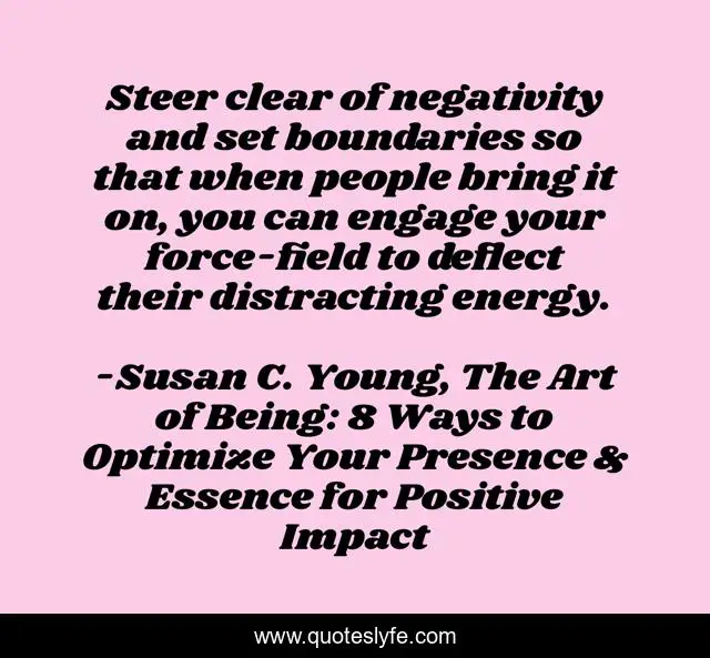 "Susan C. Young, The Art of Being: 8 Ways to Optimize Your Presence & Essence for Positive Impact Quotes." Quoteslyfe.com, 2025. Fri. 05 Dec. 2025. <https://www.quoteslyfe.com/quote/Steer-clear-of-negativity-and-set-boundaries-199351>.
