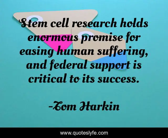 This page presents the quote "Stem cell research holds enormous promise for easing human suffering, and federal support is critical to its success.". Author of this quote is Tom Harkin. This quote is about support, suffering, research,.