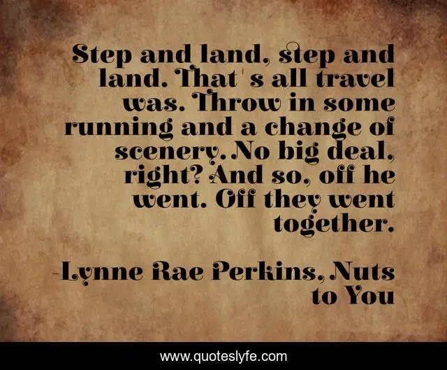 This page presents the quote "Step and land, step and land. That's all travel was. Throw in some running and a change of scenery. No big deal, right? And so, off he went. Off they went together.". Author of this quote is Lynne Rae Perkins, Nuts to You. .