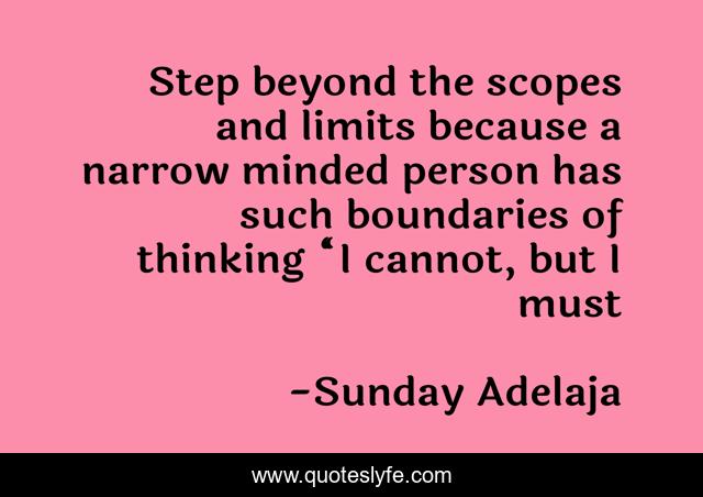 This page presents the quote "Step beyond the scopes and limits because a narrow minded person has such boundaries of thinking “I cannot, but I must". Author of this quote is Sunday Adelaja. This quote is about scopes, life, beyond, goal, limits, thinking, mission, calling, step,.