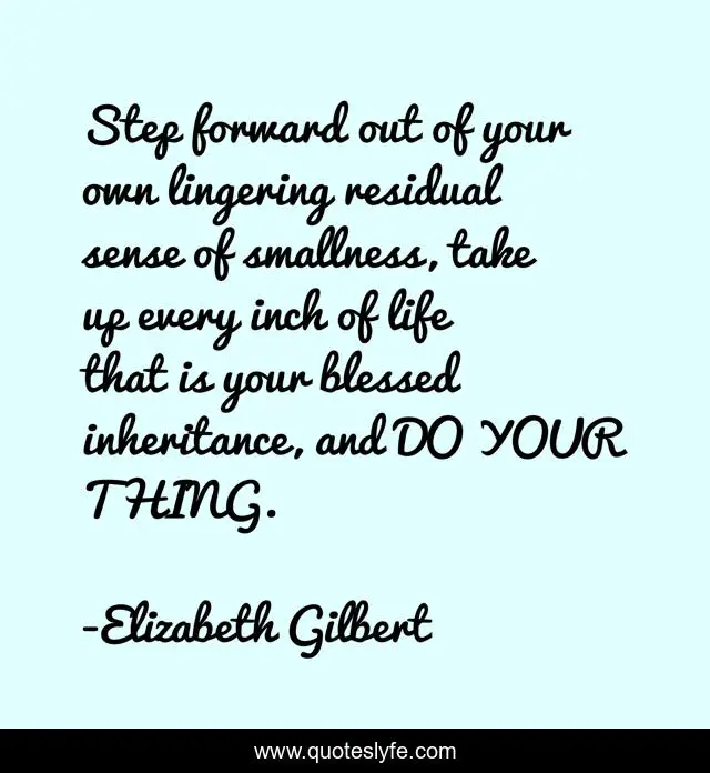 This page presents the quote "Step forward out of your own lingering residual sense of smallness, take up every inch of life that is your blessed inheritance, and DO YOUR THING.". Author of this quote is Elizabeth Gilbert. This quote is about confidence, courage,.