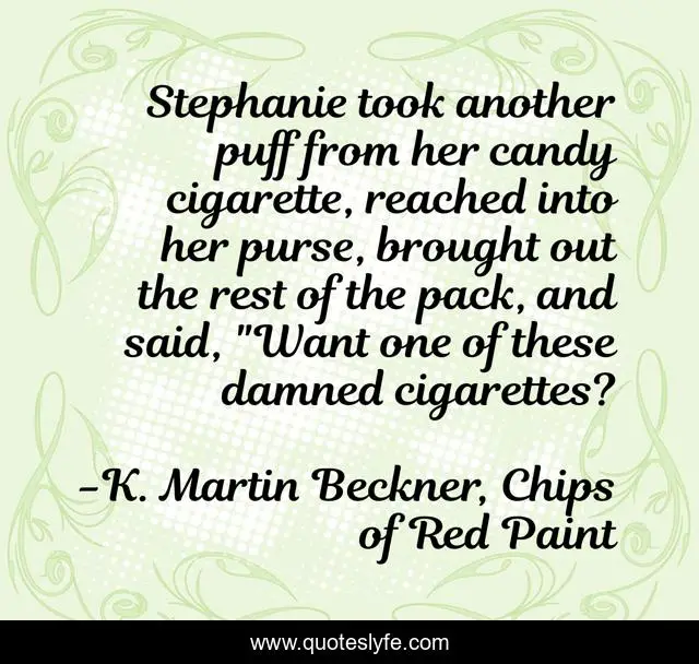 This page presents the quote "Stephanie took another puff from her candy cigarette, reached into her purse, brought out the rest of the pack, and said, "Want one of these damned cigarettes?". Author of this quote is K. Martin Beckner, Chips of Red Paint. This quote is about cigarettes, humor, growing-up,.