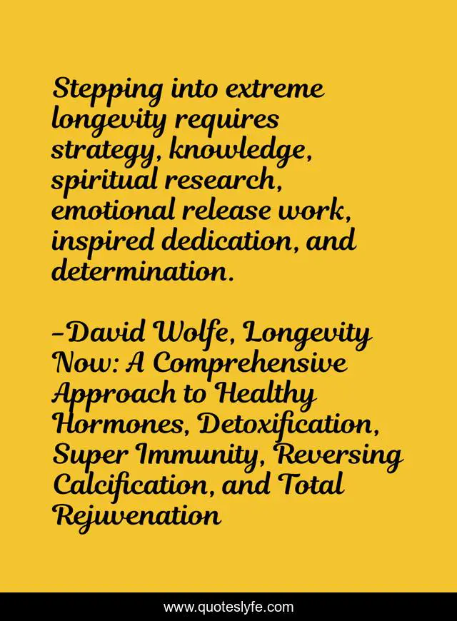 This page presents the quote "Stepping into extreme longevity requires strategy, knowledge, spiritual research, emotional release work, inspired dedication, and determination.". Author of this quote is David Wolfe, Longevity Now: A Comprehensive Approach to Healthy Hormones, Detoxification, Super Immunity, Reversing Calcification, and Total Rejuvenation. This quote is about nutrition, health, raw-foods,.