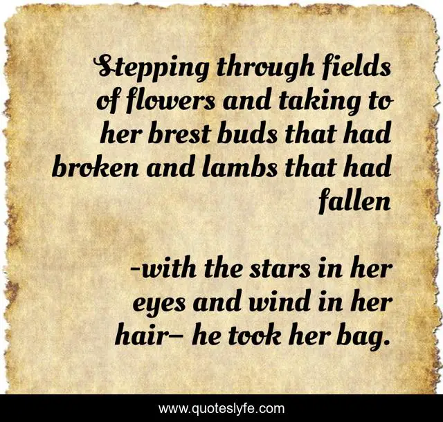 This page presents the quote "Stepping through fields of flowers and taking to her brest buds that had broken and lambs that had fallen". Author of this quote is with the stars in her eyes and wind in her hair– he took her bag.. .
