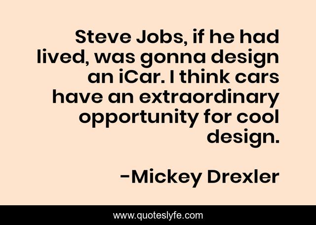 This page presents the quote "Steve Jobs, if he had lived, was gonna design an iCar. I think cars have an extraordinary opportunity for cool design.". Author of this quote is Mickey Drexler. This quote is about opportunity, think, cool,.