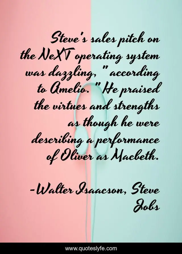 This page presents the quote "Steve's sales pitch on the NeXT operating system was dazzling, " according to Amelio. " He praised the virtues and strengths as though he were describing a performance of Oliver as Macbeth.". Author of this quote is Walter Isaacson, Steve Jobs. This quote is about influence, sales,.