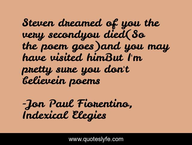 This page presents the quote "Steven dreamed of you the very secondyou died(So the poem goes)and you may have visited himBut I'm pretty sure you don't believein poems". Author of this quote is Jon Paul Fiorentino, Indexical Elegies. This quote is about loss, sadness, wit,.