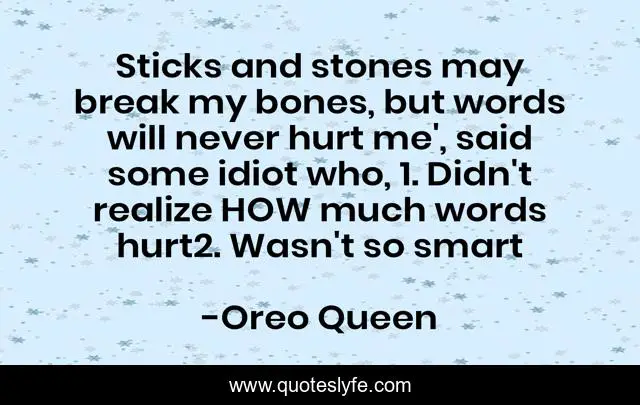 This page presents the quote "Sticks and stones may break my bones, but words will never hurt me', said some idiot who, 1. Didn't realize HOW much words hurt2. Wasn't so smart". Author of this quote is Oreo Queen. This quote is about dumbness, words-have-power, smartness, words,.