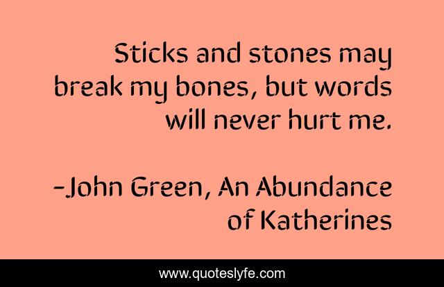 This page presents the quote "Sticks and stones may break my bones, but words will never hurt me.". Author of this quote is John Green, An Abundance of Katherines. This quote is about suffering, love, affection, hurt,.