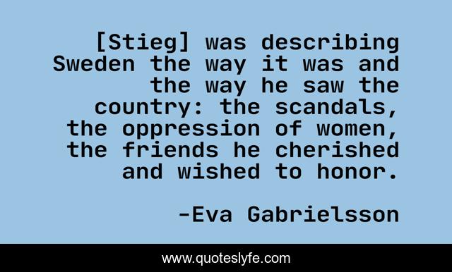 This page presents the quote "[Stieg] was describing Sweden the way it was and the way he saw the country: the scandals, the oppression of women, the friends he cherished and wished to honor.". Author of this quote is Eva Gabrielsson. This quote is about stieg-larsson, feminism, crime,.
