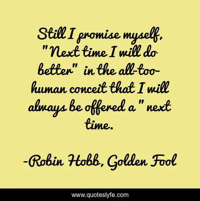 This page presents the quote "Still I promise myself, "Next time I will do better" in the all-too-human conceit that I will always be offered a "next time.". Author of this quote is Robin Hobb, Golden Fool. This quote is about conceit, improve, chance, promise, human, time, believe, opportunity, strive,.