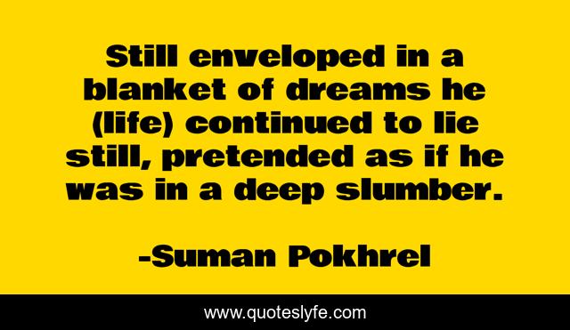 This page presents the quote "Still enveloped in a blanket of dreams he (life) continued to lie still, pretended as if he was in a deep slumber.". Author of this quote is Suman Pokhrel. This quote is about slumber, life, dream,.