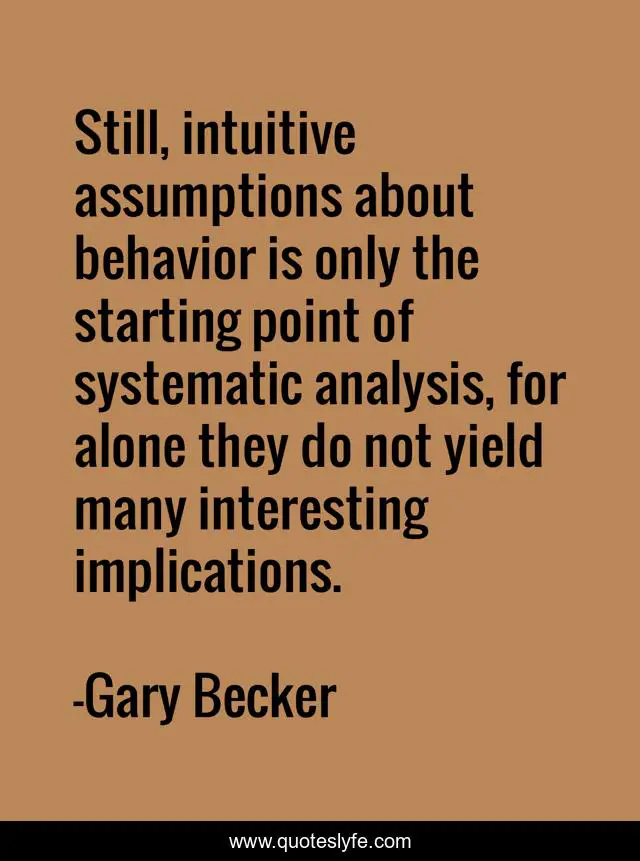 This page presents the quote "Still, intuitive assumptions about behavior is only the starting point of systematic analysis, for alone they do not yield many interesting implications.". Author of this quote is Gary Becker. This quote is about assumptions, behavior,.
